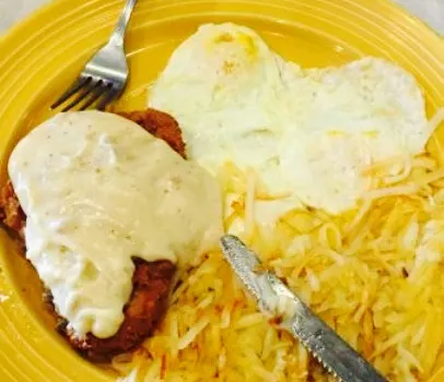 Our skillets are mixed with shredded cheese and topped with two eggs any style.